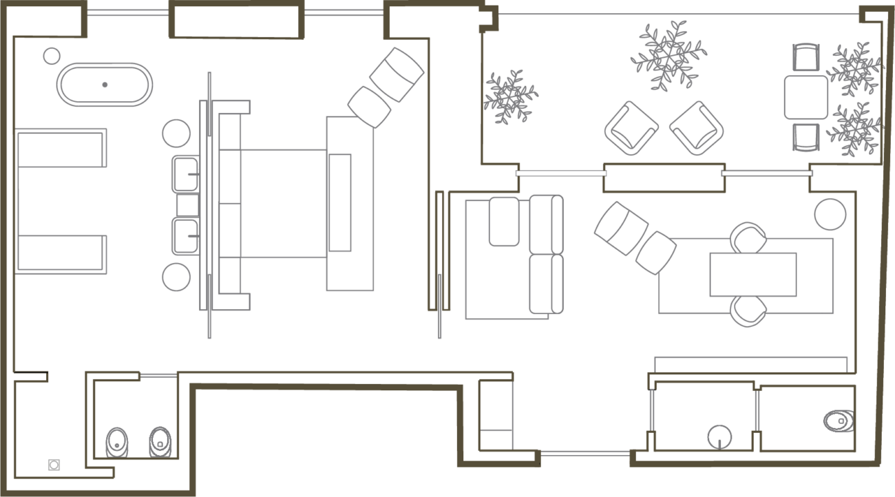 El tamaño de nuestras suites es de aproximadamente 120 metros cuadrados, ofreciendo un espacio amplio y lujoso para una estancia inolvidable.